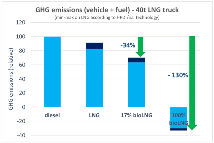 欧州の主要な天然ガスを燃料とした輸送機関を推進する団体である、The European Biogas Association (EBA)、Gas Infrastructure Europe (GIE) 、The Natural & bio Gas Vehicle Association (NGVA Europe)、SEA-LNGの共著である“Bio-LNG IN TRANSPORT: MAKING CLIMATE NEUTRALITY A REALITY”(バイオLNGを燃料とした輸送でカーボンニュートラルを現実に)では40トンの大型トラックの場合でのディーゼル車とLNG燃料車のCO2排出量の比較をしています。それによれば、化石燃料由来のLNG(液化天然ガス)に17%のバイオ由来のLNGを混ぜることにより、ディーゼル車両比でCO2を34%削減することが可能であることが報告されています。インフラが整い、バイオLNGの供給量が安定して、100%バイオ由来のLNGを燃料とすることができれば、ディーゼル車両比ではカーボンクレジットが発生するほどのCO2削減が可能です。※下記図参照